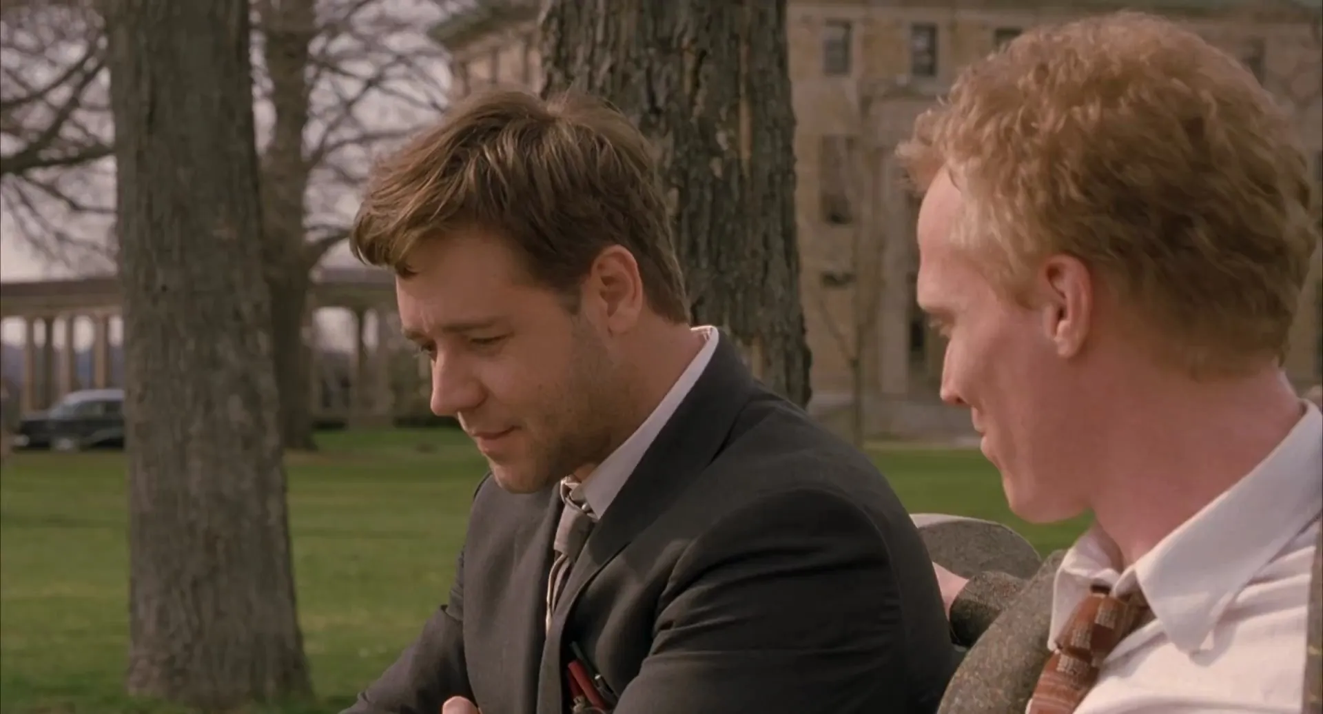 Cast: Russell Crowe as John Nash, Jennifer Connelly as Alicia Nash, Tom McNutt as , Ed Harris as William Parcher, Paul Bettany as Charles Herman, Christopher Plummer as Dr. Rosen, Josh Lucas as Martin Hansen, Adam Goldberg as Richard Sol, Anthony Rapp as Bender, Judd Hirsch as Helinger, Jason Gray-Stanford as Ainsley Neilson, Austin Pendleton as Thomas King, Vivien Cardone as Marcee, Jillie Simon as Bar Co-Ed, Victor Steinbach as Prof. Horner, Tanya Clarke as Becky, Thomas F. Walsh as Captain, Jesse Doran as General, Kent Cassella as Analyst, Patrick Blindauer as MIT Student, John Blaylock as Photographer, Roy Thinnes as Governor, Anthony Easton as Young Man, Cheryl Howard as Harvard Administrator, Josh Pais as Princeton Professor, David B. Allen as John Nash Teenager, Michael Esper as John Nash Young Man, Erik Van Wyck as Princeton Student, Rance Howard as White-Haired Patient, Jane Jenkins as Code-Red Nurse, Darius Stone as Adjunct, Valentina Cardinalli as Joyce, Teagle F. Bougere as Young Professor, Amy Walz as Blond in Bar, Tracey Toomey as Brunette, Jennifer Weedon as Brunette, Yvonne Thomas as Brunette, Holly Pitrago as Brunette, Isadore Rosenfeld as Pen Ceremony Professor, Alex Toma as Toby, Bryce Dallas Howard as Student at Harvard University (Uncredited)